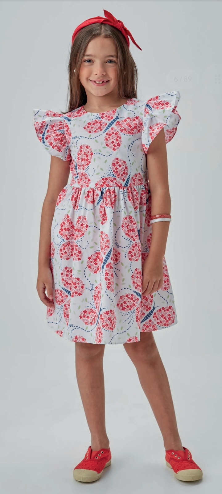 Vestido rodado em tricoline de algodão com estampa exclusiva de flores e borboletas com detalhe nas costas, cor vermelho - BEABÁ
